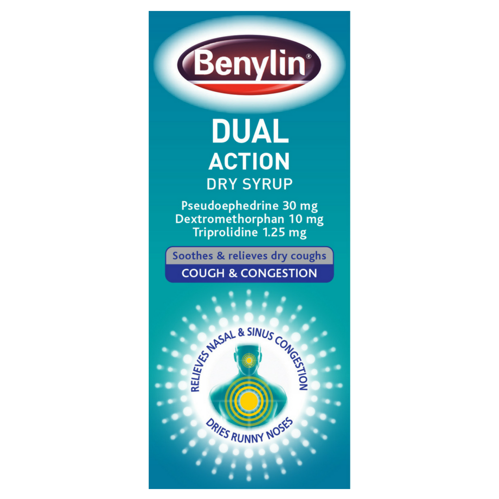 Benylin Dual Action Dry Syrup helps to relieve dry coughs and congestion. The active ingredient dextromethorphan helps to stop persistent coughing. The syrup also contains triprolidine hydrochloride, an antihistamine which helps to stop sneezing, runny nose and watery eyes. Pseudoephedrine hydrochloride that unblocks stuffy noses.
