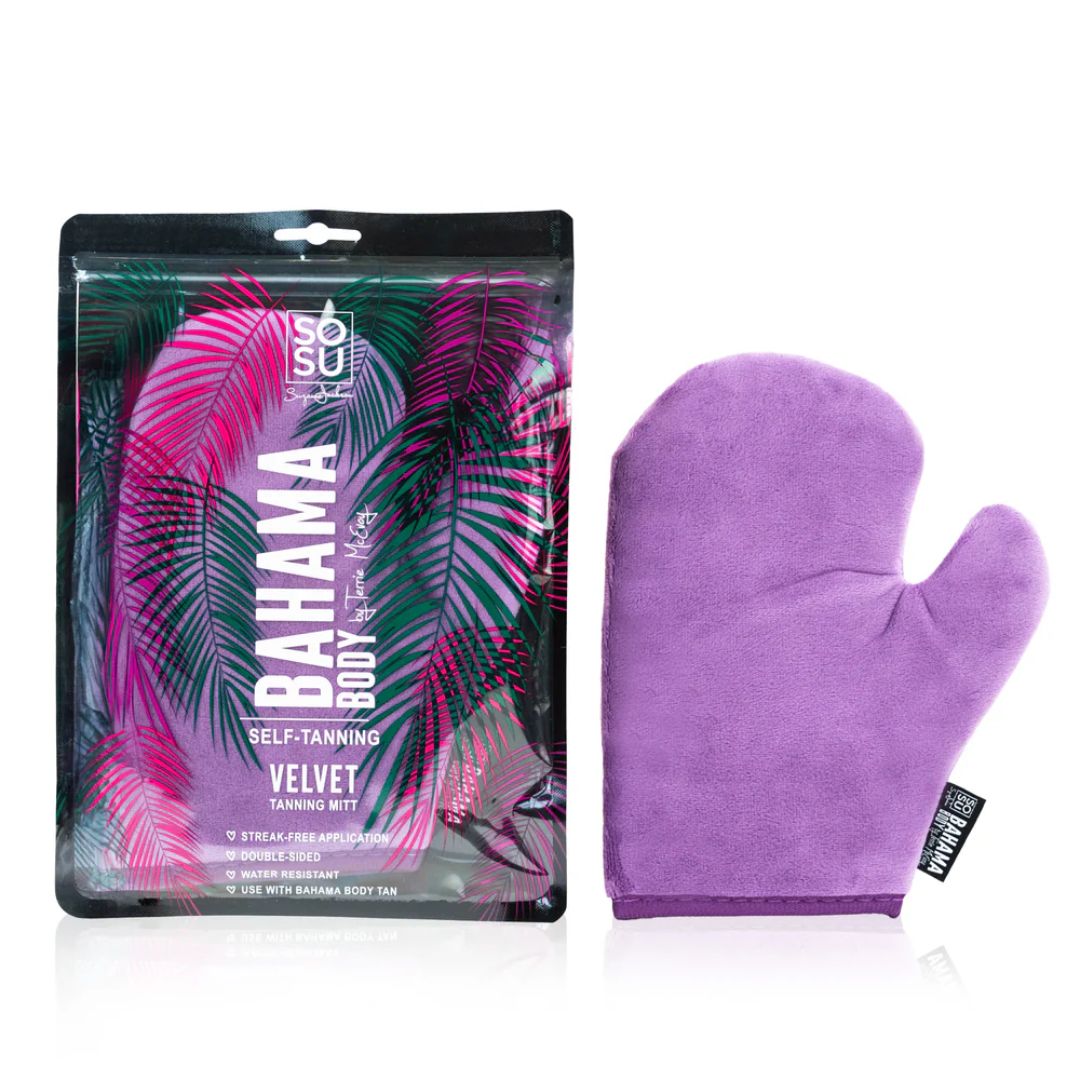 This double-sided, super-soft velvet mitt is the perfect accessory for applying your Bahama Body self-tan at home, streak-free. The inner waterproof lining will keep your hand protected & stain-free. The built-in thumb feature allows for easier application and movement over the body.